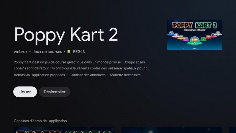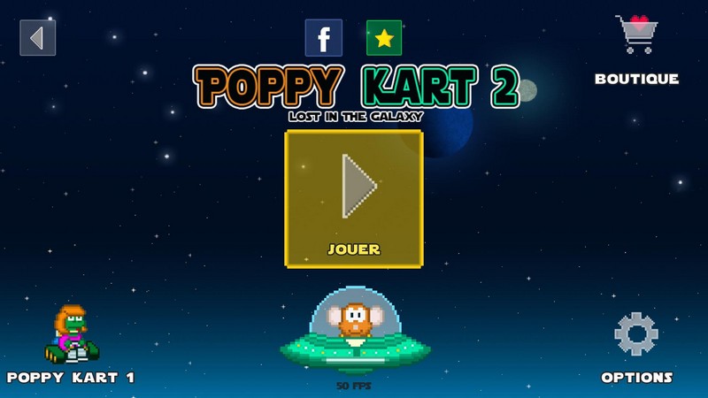 Disponible sur Android TV, et par extension sur les players Freebox Pop et mini 4K, Poppy Kart 2 est un jeu de course galactique dont les graphismes volontairement pixelisés et les musiques enfantines rappellent grandement les débuts de la saga Mario Kart. L’utilisateur dispose de différents vaisseaux spatiaux pour venir à bout de 28 courses.