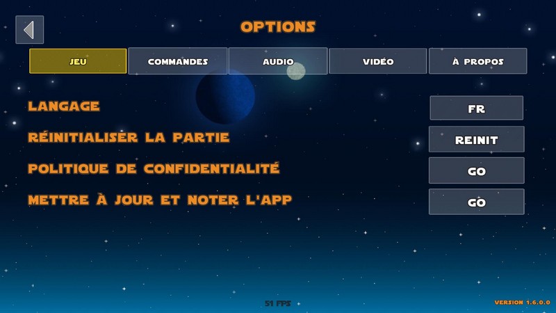 Depuis les paramètres du jeu, on peut déjà choisir la traduction française pour l’interface. De là, on pourra également réinitialiser la partie, solliciter la mise à jour du jeu, activer l’accélération automatique (pour la partie commandes), ajuster le volume de la musique et des bruitages ou encore afficher la fréquence d’affichage (les fameux FPS).