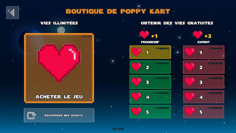 Les crédits pour jouer peuvent être obtenus au moyen des publicités, des crédits propres à chaque mode de jeu. Des vies illimitées sont également disponibles après l’achat du jeu à 4,99 euros.