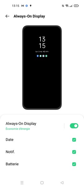 Le mode Always-On Display personnalisable (date, heure, notifications et batterie)