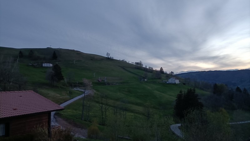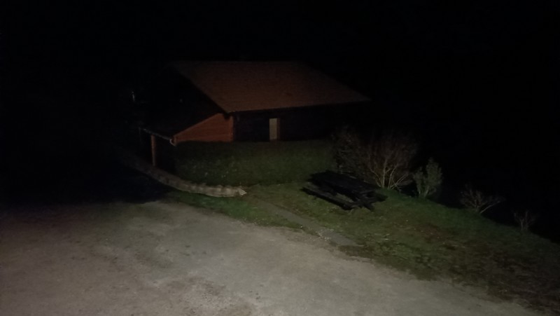 Une photo en fin de journée, puis une photo en pleine nuit avec un éclairage intérieur très léger, puis les versions corrigées par le mode nuit (option “Nuit” accessible tout droit à gauche) :