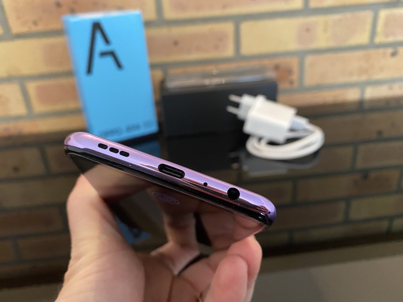 De face, l’Oppo A94 5G est un smartphone parmi d’autres, à savoir un écran assez grand poinçonné pour accueillir le capteur photo frontal. Au dos, il revendique son écurie (mais pas au point d’un Realme 8 Pro) et opte pour un dégradé (bleu vers violet dans notre cas ou blanc vers noir pour l’autre coloris existant). C’est beau sans être tape-à-l’oeil.