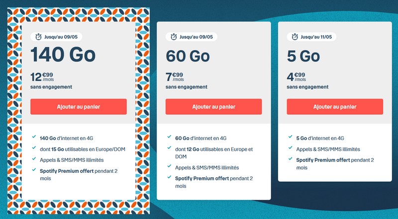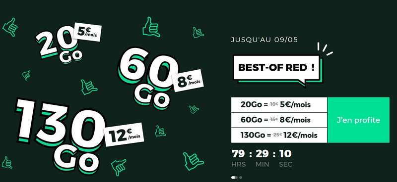 Mais voilà que Red by SFR semble revenir à la charge sur les petits prix au travers d’une opération “Best-of Red” pouvant faire écho auprès de certains consommateurs, sachant que les abonnés 4G consomment en moyenne 10,5 Go de data par mois. La marque de l’opérateur au carré rouge vient en effet de dévoiler des forfaits 20 et 60 Go à 5 et 8 euros (au lieu de 10 et 15 euros) disponibles jusqu’au 9 mai. Elle propose par ailleurs un forfait 130 Go disponible à 12 Go en version 4G ou 17 euros en version 5G. “Des prix sans engagement qui ne doublent pas au bout d’un an”, est-il d’ailleurs précisé concernant ces forfaits. Mais après ?