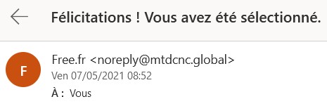 “Félicitations ! Vous avez été sélectionné”, telle est la promesse d’un e-mail avec comme expéditeur affiché “Free.fr”.