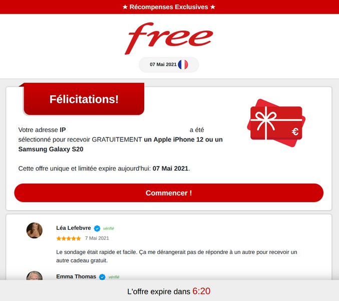 Si l’internaute consulte l’e-mail depuis son mobile et tapote volontairement (ou involontairement) sur l’une des images, il atterrira sur une page Web lui indiquant que son adresse IP a été sélectionné (sans ’e’ à la fin, évidemment) pour recevoir gratuitement un Apple iPhone 12 ou un Samsung Galaxy S20. Pour le presser un peu plus, félicitations, gros bouton rouge et commentaires d’utilisateurs gâtés sont de la partie. Sans oublier ce petit décompte de 6 minutes et 30 secondes bien en vue.
