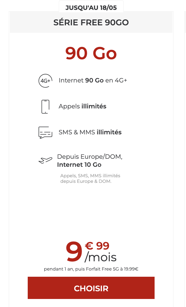 La bataille de la data mais aussi des prix bat son plein chez Red by SFR et B&You. Face à l’offensive, Free Mobile semble réagir en modifiant sans plus attendre son offre intermédiaire “Série Free”. Après avoir proposé 70 Go de données en France métropolitaine et 10 Go en roaming, mercredi 5 mai, le tout à 10,99€/mois., l’opérateur booste aujourd’hui son forfait. L’offre est la plus alléchante depuis son lancement en juillet 2018. Jusqu’au 18 mai prochain, Free Mobile propose 90 Go de data à 9,99€/mois.