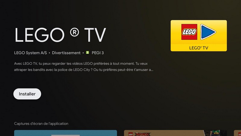Il faut tout d’abord se rendre dans le Play Store de votre Freebox pour télécharger l’application Lego TV qui est disponible gratuitement, pèse quelques dizaines de mégaoctets et dont la dernière mise à jour remonte à février dernier.
