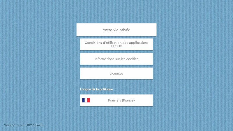 Pas de paramètres à foison ici. Au mieux pourra-t-on changer la langue pour les mentions légales, accessibles après un appui sur la flèche du haut depuis la page d’accueil.