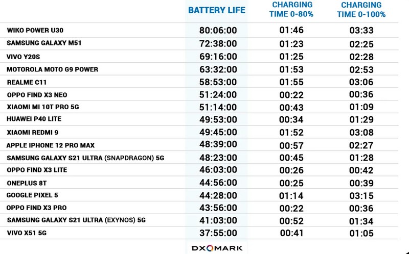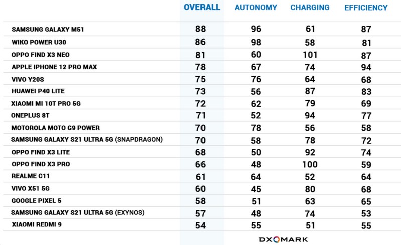 Ci-dessous, un classement de 17 smartphones, avec un podium formé par les Wiko Power U30, Samsung Galaxy M51 et Vivo Y20s. Avec une batterie 6 000 mAh, le Wiko Power U30 dépasse le Samsung Galaxy M51 équipé d’une batterie 7 000 mAh.