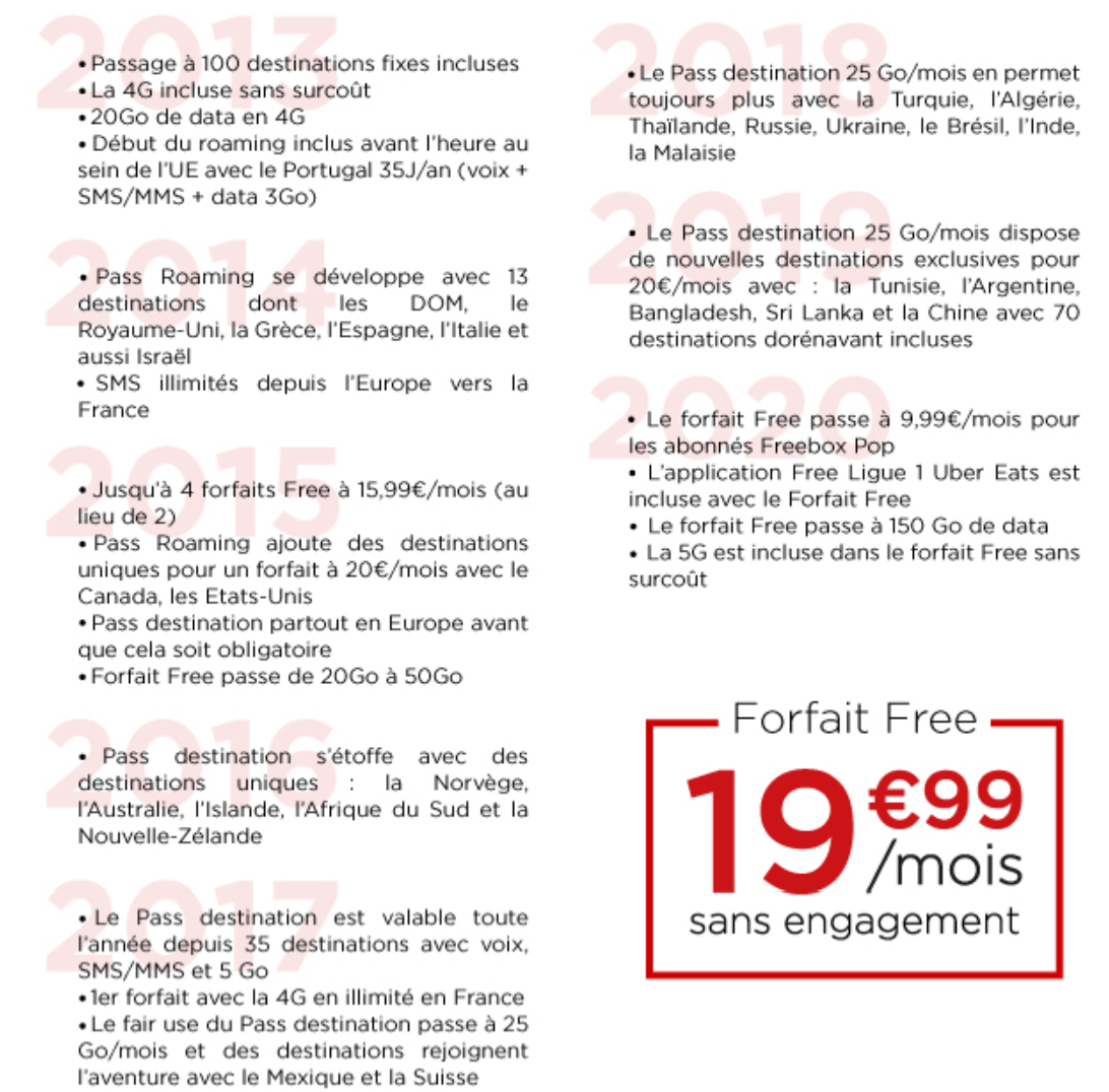 Chez la plupart des opérateurs, dès qu’il y a enrichissement de leurs forfaits mobile, c’est toujours en échange d’une augmentation de tarif. Mais pas chez Free, comme le montre l’opérateur sur un tableau publié sur Twitter. On peut en effet voir sur le tableau ci-dessous, qu’au cours des années, tous les abonnés, nouveaux comme ancien, ont vu s’ajouter la 4G et la 5G incluses, le roaming à l’international, l’enveloppe de data augmenter régulièrement, jusqu’à devenir illimitée pour les abonnés Freebox. Le tarif, quant à lui, est resté scotché à 19,99€/mois, et même 15,99€/mois pour les abonnés Freebox et 9,99€ pour les abonnés Freebox Pop.