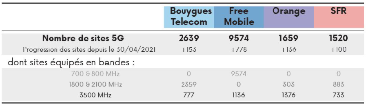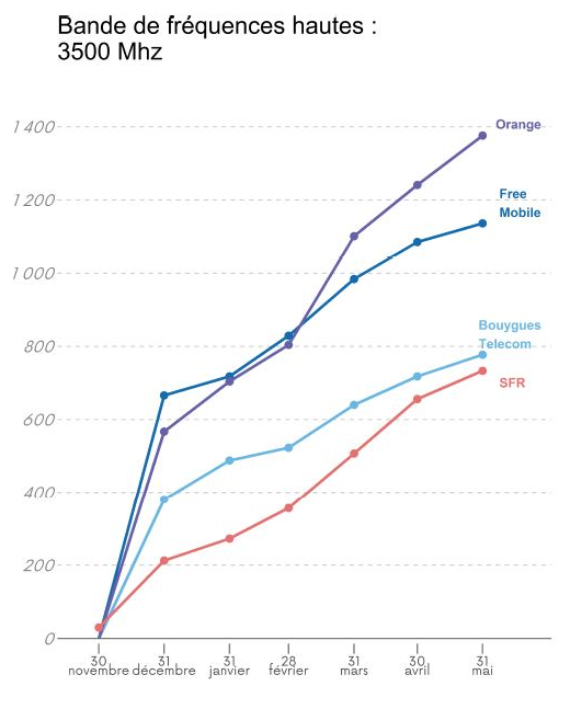 Sur la seule bande 3,5 GHz, Orange prend les devants avec 1376 sites activés, devant Free Mobile qui continue à progresser avec 1136 sites actif mais perd un peu de terrain face à Orange. Derrière, suit Bouygues Télécom avec 777 antennes et enfin SFR, avec 733 sites émettant sur la bande 3,5GHz.