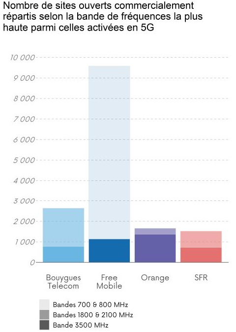 Les stratégies des opérateurs diffèrent également quant aux emplacements des sites, notamment en 3,5 GHz : tous les opérateurs ne couvrent pas nécessairement les mêmes villes. Ainsi, Orange, Bouygues Télécom et SFR concentrent leurs sites sur peu d’agglomérations mais avec une plus forte densité de sites, quand Free et préfère les répartir sur un grand nombre de villes.