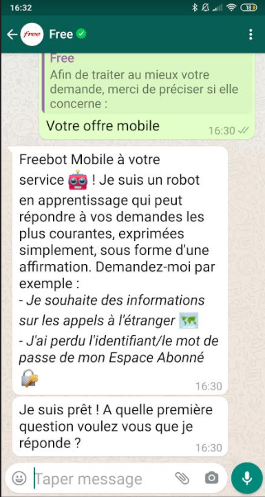 Free explique que Freebot a été pensé pour l’univers mobile. Il est capable de répondre aux questions des abonnés FreeMobile, mais aussi à des questions concernant les offres et les différents services proposés. Ce service est Intégré aujourd’hui sur sur le canal WhatsApp de Free et bientôt en remplacement du Chatbot Mobile positionné dans l’aide en ligne de notre page de contact Abonné mobile,