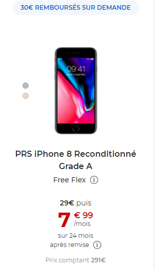 Le second smartphone concerné est l’iPhone 8 reconditionné Grade A qui bénéficie d’une ODR de 30 euros. Avec Free Flex, sur une durée de 24 mois pour ce mobile, le premier paiement sera de 29€ (au lieu de 69€ sans l’ODR), puis 24 loyers suivants de 7.99€/mois. A l’issue des 24 mois, vous avez le choix entre restituer votre mobile ou l’acquérir en versant le montant de l’option d’achat de 40€.