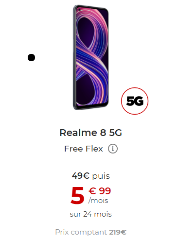 Un nouveau smartphone vient de faire son apparition dans la boutique Free Mobile. Il s’agit du Realme 8 5G disponible en 128 Go et en coloris Noir. Il est commercialisé au tarif de 219€ en paiement comptant, soit le smartphone 5G le moins cher de la boutique. Il est également possible de se le procurer via la nouvelle offre Free Flex : sur une durée de 24 mois pour ce mobile, avec un 1er paiement de 49€, puis 24 loyers suivants de 5.99€/mois. A l’issue des 24 mois, vous avez le choix entre restituer votre mobile ou l’acquérir en versant le montant de l’option d’achat de 26€. Le montant total dû en cas de levée de l’option d’achat à l’issue des 24 mois sera de 219€TTC. A cela s’ajoute 10€ si livraison à domicile (gratuit si c’est en relais).