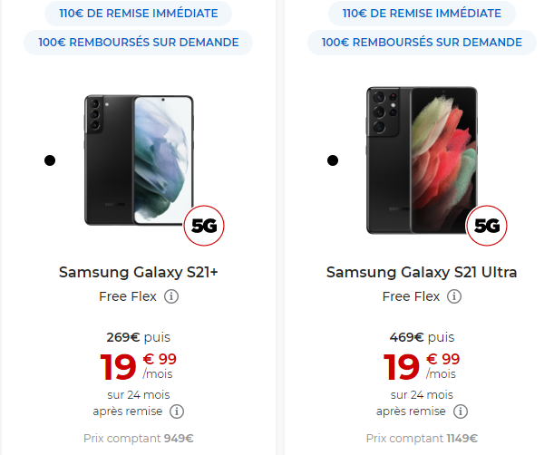 Concernant le Samsung Galaxy S21+ son tarif passe de à 1059 à 849€ (déduction faite de la remise immédiate de 110€ et de l’ODR de 100€) Avec Free Flex, sur une durée de 24 mois pour ce mobile, le premier paiement sera de 369€, puis 24 loyers suivants de 19.99€/mois. A l’issue des 24 mois, vous avez le choix entre restituer votre mobile ou l’acquérir en versant le montant de l’option d’achat de 100€