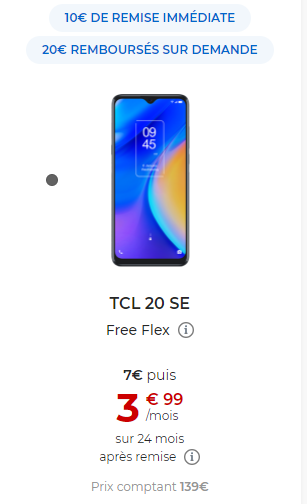 Free Mobile lance une remise immédiate sur un des smartphones les moins cher de la boutique, à savoir le TCL 20 SE. Son prix passe ainsi de 149€ à 139€, en achat comptant, soit 10€ de moins Mais ce smartphone bénéficie également d’une offre de remboursement de 20€, ce qui porte son tarif final à 119€.