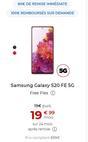 Free a baissé de 60€ temporairement le tarif d’un des smartphones Samsung, à savoir le Galaxy S20 FE 5G, ce qui fait passer son tarif de 759€ à 699€. Et ce n’est pas tout puisque si vous choisissez la formule Free Flex, s’ajoute à cela une l’offre de remboursement proposée par Free de 100€ ce qui port le tarif final à 599€