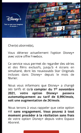 En dehors de cette offre, le service de vidéos illimitées de Disney est proposé à 8,99€/mois. Il a en effet subi une augmentation de 2€ suite à l’arrivée d’une rubrique pour adulte nommée “Star”. Mais pour les abonnés Freebox qui ont bénéficié de la gratuité durant 6 mois, et qui ont conservé le service, le prix était resté à 6,99€. Malheureusement Free annonce par mail aux abonnés concernés que Disney+ passera au tarif normal, soit 8,99€/mois, à compter du 1er novembre.