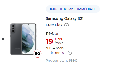 Concernant le Samsung Galaxy S21 son tarif passe de à 859€ à 699€ soit 160€ de remise. Avec Free Flex, sur une durée de 24 mois pour ce mobile, le premier paiement sera de 119€, puis 24 loyers suivants de 19.99€/mois. A l’issue des 24 mois, vous avez le choix entre restituer votre mobile ou l’acquérir en versant le montant de l’option d’achat de 100€
