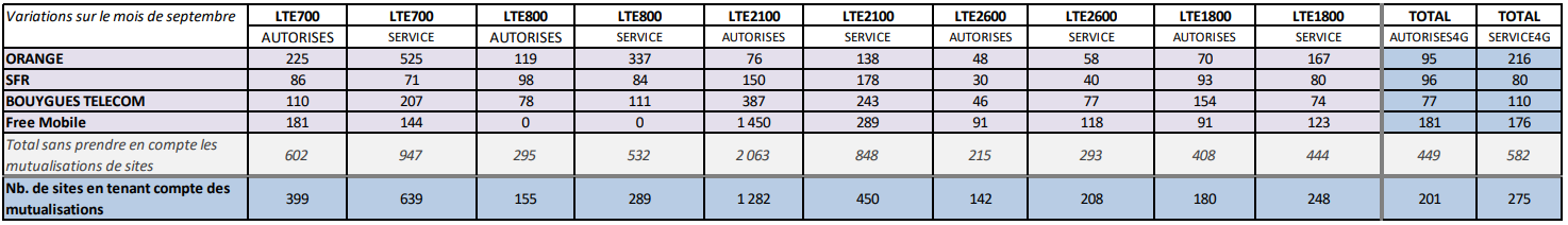 Le bilan des sites 4G mis en service en métropole s’établit comme suit :