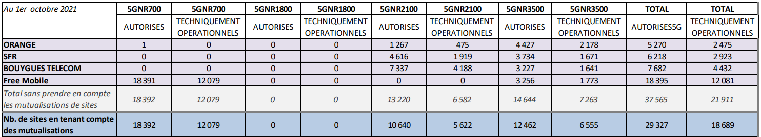 Sur la seule bande 3,5 GHz, qui est la fréquence coeur, Orange conserve son avance avec 2178 sites activés, devant Free Mobile et ses 1773 sites en service. Suivent SFR (1671 supports) et Bougues Télécom (1641 sites). Un même site peut être équipé de plusieurs bandes de fréquences pour fournir le service 5G. Ainsi, le nombre de sites total peut être inférieur à la somme des sites répartis selon les bandes de fréquences.