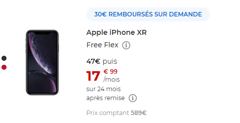 Le premier smartphone est l’Phone XR, qui bénéficie d’une ODR de 30 euros. Avec Free Flex, sur une durée de 24 mois pour ce mobile, le premier paiement sera de 47€ (au lieu de 77€ sans ODR), puis 24 loyers suivants de 17.99€/mois. A l’issue des 24 mois, vous avez le choix entre restituer votre mobile ou l’acquérir en versant le montant de l’option d’achat de 80€. A défaut de choix, prorogation tacite du contrat pour des périodes successives d’un mois. Cette ODR est proposée jusqu’au 27 octobre