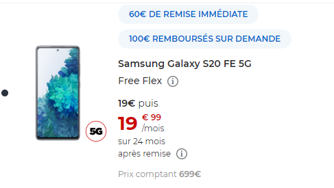 Enfin le troisième smartphone est le Galaxy S20 FE 5G, qui bénéficie d’une ODR de100 euros. Avec Free Flex, sur une durée de 24 mois pour ce mobile, le premier paiement sera de 19€ (au lieu de 119€ sans ODR), puis 24 loyers suivants de 19.99€/mois. A l’issue des 24 mois, vous avez le choix entre restituer votre mobile ou l’acquérir en versant le montant de l’option d’achat de 100€. A défaut de choix, prorogation tacite du contrat pour des périodes successives d’un mois. Cette ODR est proposée jusqu’au 27 octobre