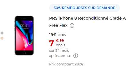 Vous souhaitez vous offrir un iPhone pour pas trop cher ? Vous pouvez opter pour un smartphone reconditionné sur le site de Free Mobile. L’opérateur vient de baisser le tarif de l’iPhone 8 reconditionné 64Go, qui passe de 299€ à 282€ en paiement comptant. Un petite baisse de 17€, mais qui fait toujours plaisir sur ce genre de modèle abordable.
