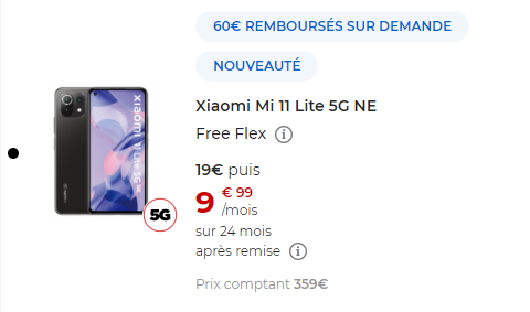 Enfin le dernier smartphone est le Xiaomi Mi 11 Lite 5G NE (pour nouvelle édition), qui bénéficie d’une ODR de 60 euros. Avec Free Flex, sur une durée de 24 mois pour ce mobile, le premier paiement sera de 19€ (au lieu de 79€ sans ODR), puis 24 loyers suivants de 9.99€/mois. A l’issue des 24 mois, vous avez le choix entre restituer votre mobile ou l’acquérir en versant le montant de l’option d’achat de 40€. A défaut de choix, prorogation tacite du contrat pour des périodes successives d’un mois. Cette ODR est proposée jusqu’au 29 novembre.