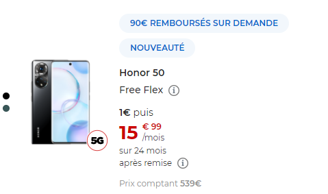 Le premier smartphone concerné est l’e Honor 50 qui bénéficie d’une ODR de 90 euros. Avec Free Flex, sur une durée de 24 mois pour ce mobile, le premier paiement sera de 1€ (au lieu de 91€ sans ODR), puis 24 loyers suivants de 15.99€/mois. A l’issue des 24 mois, vous avez le choix entre restituer votre mobile ou l’acquérir en versant le montant de l’option d’achat de 70€. A défaut de choix, prorogation tacite du contrat pour des périodes successives d’un mois. Cette offre est valable jusqu’au 29 novembre.