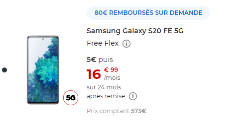 Le deuxième smartphone concerné est le Samsung Galaxy S20 FE 5G qui bénéficie d’une ODR de 80 euros. Avec Free Flex, sur une durée de 24 mois pour ce mobile, le premier paiement sera de 5€ (au lieu de 85€ sans l’ODR), puis 24 loyers suivants de 16.99€/mois. A l’issue des 24 mois, vous avez le choix entre restituer votre mobile ou l’acquérir en versant le montant de l’option d’achat de 80€. Cette offre est valable jusqu’au 29 novembre.