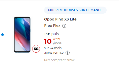 Un autre smartphone concerné est l’Oppo Find X3 Lite qui bénéficie d’une ODR de 60 euros. Avec Free Flex, sur une durée de 24 mois pour ce mobile, le premier paiement sera de 15€ (au lieu de 75€ sans l’ODR), puis 24 loyers suivants de 10.99€/mois. A l’issue des 24 mois, vous avez le choix entre restituer votre mobile ou l’acquérir en versant le montant de l’option d’achat de 50€. Cette offre est valable jusqu’au 29 novembre.