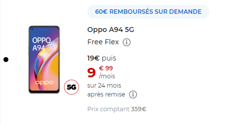 Viens ensuite l’Oppo A94 5G qui bénéficie d’une ODR de 60 euros. Avec Free Flex, sur une durée de 24 mois pour ce mobile, le premier paiement sera de 19€ (au lieu de 79€ sans l’ODR), puis 24 loyers suivants de 9.99€/mois. A l’issue des 24 mois, vous avez le choix entre restituer votre mobile ou l’acquérir en versant le montant de l’option d’achat de 40€. Cette offre est valable jusqu’au 29 novembre.