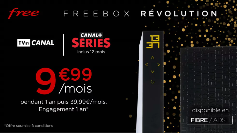 Nous vous l’annoncions dimanche, Free lance ce soir une nouvelle offre sur le site Veepee.fr. Celle-ci vient d’être dévoilée et propose la Freebox Révolution à 9,99€/mois durant un an puis 39,99€/mois. Cela inclut le forfait Freebox, mais également TV by Canal et pour la première fois Canal+ Série offert durant 12 mois. Cette offre promotionnelle, valable jusqu’au 21 décembre à 6h est soumise à conditions, avec engagement de 12 mois, sous réserve d’éligibilité, hors prestations tarifées à l’acte ou optionnelles, hors cas de construction de ligne, réservée aux membres de veepee.fr :
