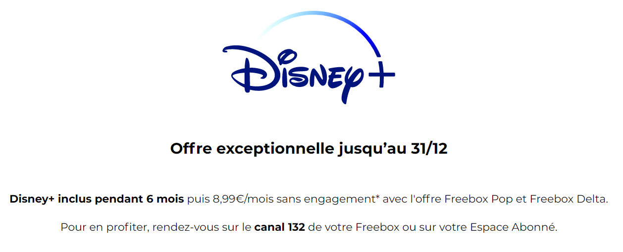 L’opérateur précise que jusqu’au 31/12/2021, Disney+ est inclus 6 mois puis 8,99€/mois pour “les abonnés Freebox mini 4K, Freebox Pop, Freebox Delta et Freebox One qui ne sont pas déjà abonnés Disney+, sous réserve d’activation du service dans un délai de deux mois à compter de l’activation de la ligne. Disponible en France métropolitaine, sur TV et PC/Mac depuis www.disneyplus.com ou sur tablette et smartphone via l’application Disney+. Création d’un compte auprès de Disney+ nécessaire. Voir conditions sur www.disneyplus.com. ©2021 Disney et ses sociétés affiliées. Tous droits réservés. La résiliation prendra effet à la fin de la période de facturation en cours.”