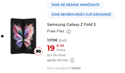 Le premier smartphone est le Galaxy Z Fold 3, dont le prix passe de 1799€ à 1699€, soit 100€ de remise. A cela s’ajoute une offre de remboursement de 100€, ce qui porte le prix final de ce smartphone à 1599€.