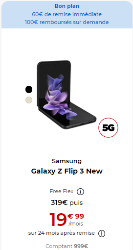 Le troisième smartphone est le Galaxy Z Flip 3 New, dont le prix passe de 1059€ à 999€, soit 60€ de remise. A cela s’ajoute une offre de remboursement de 100€, ce qui porte le prix final de ce smartphone à 899€.