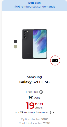 Enfin le dernier est le Samsung Galaxy S21 FE 5G qui bénéficie d”une ODR de 170€. Il est disponible avec Free Flex : sur une durée de 24 mois pour ce mobile, le premier paiement sera de 171€ (soit 1€ en déduisant l’ODR) puis 24 loyers suivants de 19.99€/mois. A l’issue des 24 mois, vous avez le choix entre restituer votre mobile ou l’acquérir en versant le montant de l’option d’achat de 108€.