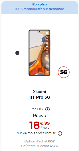 Le premier smartphone concerné est le Xiaomi 11T Pro 5G, qui bénéficie d’une ODR de 100€. Avec Free Flex : sur une durée de 24 mois pour ce mobile, le premier paiement sera de 101€ (soit 1€ en déduisant l’ODR de 100€) puis 24 loyers suivants de 19.99€/mois. A l’issue des 24 mois, vous avez le choix entre restituer votre mobile ou l’acquérir en versant le montant de l’option d’achat de 80€.