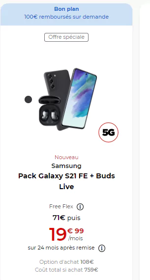Free vient de lancer un nouveau pack dans sa boutique en ligne. Celui-ci est constitué du Galaxy S21 FE avec des écouteurs Galaxy Buds Live offerts ainsi qu’une offre de remboursement de 100€. Cette promotion est valable uniquement avec la formule Free Flex.