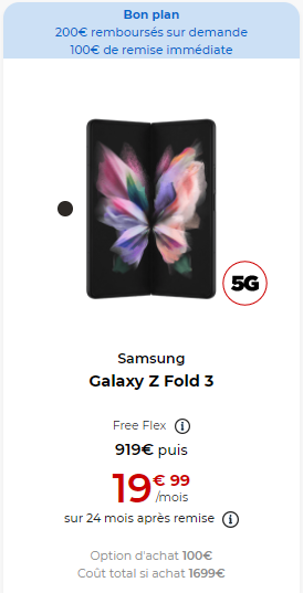Le premier smartphone est le Galaxy Z Fold 3, dont le prix passe de 1799€ à 1699€, soit 100€ de remise immédiate. A cela s’ajoute une offre de remboursement de 200€, ce qui porte le prix final de ce smartphone à 1499€.