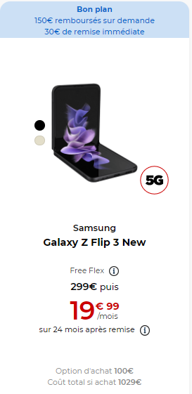 Le deuxième smartphone est le Galaxy Z Flip 3 New, dont le prix passe de 1059€ à 1029€, soit 30€ de remise. A cela s’ajoute une offre de remboursement de 150€, ce qui porte le prix final de ce smartphone à 879€.