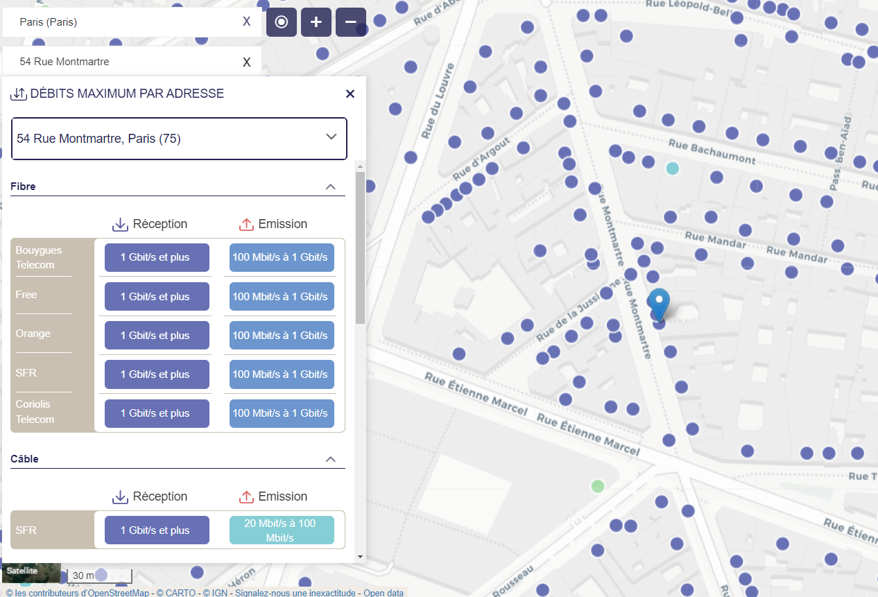 Très utile pour un grand nombre de Français, ce moteur de recherche de l’internet fixe rassemble sous forme de cartes toutes les informations sur les débits proposés par les opérateurs, pour l’ensemble des technologies de l’internet fixe en France métropolitaine et en Outre-Mer. Son utilisation est simple comme bonjour, pour une adresse donnée, l’outil affiche l’ensemble des opérateurs disponibles, le réseau filaire (fibre, câble, ou xDSL) ou hertzien (4G fixe, HD et THD radio, satellite) et donc les débits maximum pouvant être obtenus.