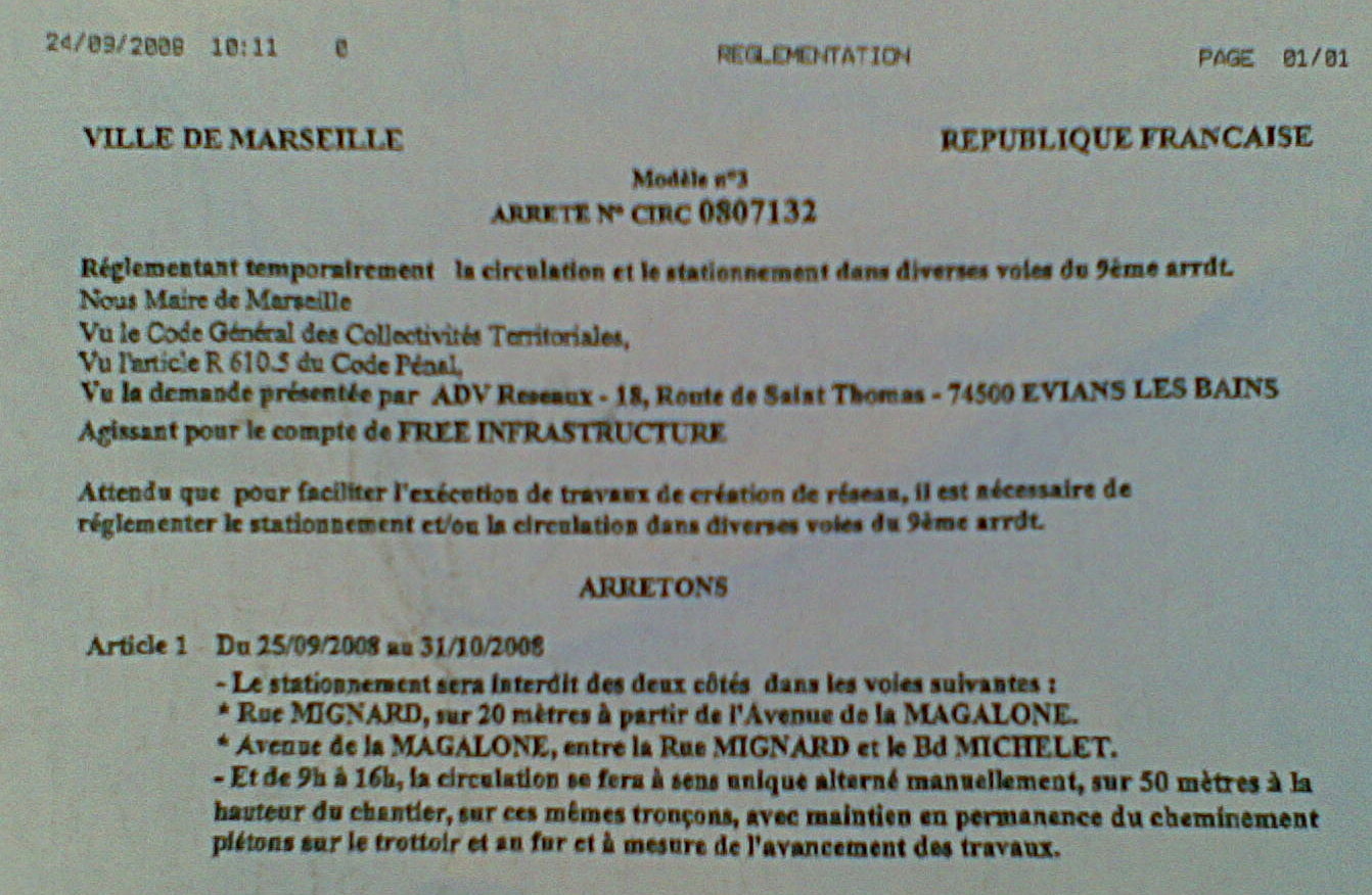 Les Marseillais sont à l’honneur ! Fafamonteko, un Freenaute, lecteur d’Univers Freebox, nous a envoyé quelques clichés des travaux de fibre optique, réalisés pour Free Infrastructure ! La fibre est déposée par Prothéa / Comares (sociétés mandatées par ADV Réseaux).