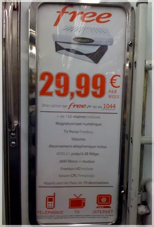 Après les campagnes de publicité 4×3 au niveau national, Free a lancé hier une nouvelle campagne d’affichage dans le métro parisien. Comme pour la campagne précédente, c’est la charte graphique du site web de Free qui est reprise :