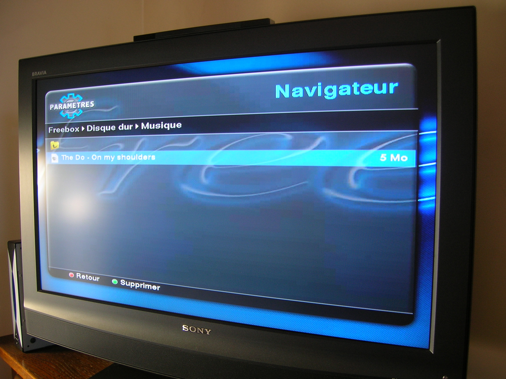 Une fois votre fichier audio au format MP3 vu par la Freebox – donc préalablement envoyé par FTP – il suffit de lancer la lecture comme vous le feriez avec un fichier vidéo classique. Le lecteur apparaît mais bien évidemment aucune image ne s’affiche sur l’écran, juste l’audio au format MP3 s’il vous plaît !