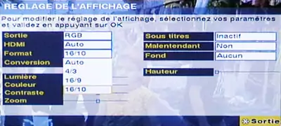 Pour utiliser le format 16/10, il suffit d’appuyer sur la touche jaune (avec une flèche) de la télécommande et de se rendre sur « Format ».