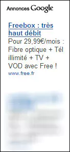 Si l’offre fibre optique de Free se développe doucement, le fournisseur d’accès à internet commence à communiquer dessus. Certes, les spots sur TF1 ne sont pas pour demain, mais l’offre est déjà mise en avant dans les annonces Google.