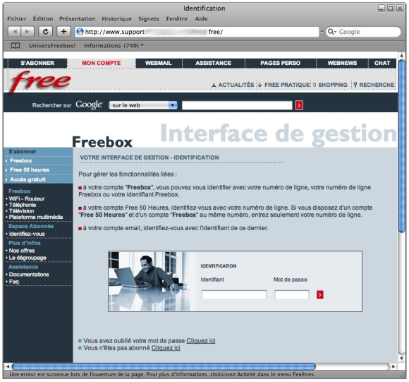 Le pirate invite les abonnés à visiter un site afin de récupérer un système de sécurité total mis à disposition par Free. Comme vous pouvez le voir sur la capture (ci dessous), le site utilisé par le pirate est totalement identique à l’ancienne console de gestion des abonnés :